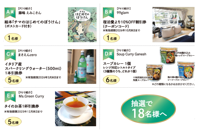 紹介したお店や企業から、素敵な読者プレゼントをご提供いただいております。毎回多くの皆様からのご応募と共に、読者の声も多数寄せていただき、本当にありがとうございます。WEBからもご応募いただけます。(全ページを見て、質問にお答えください)
