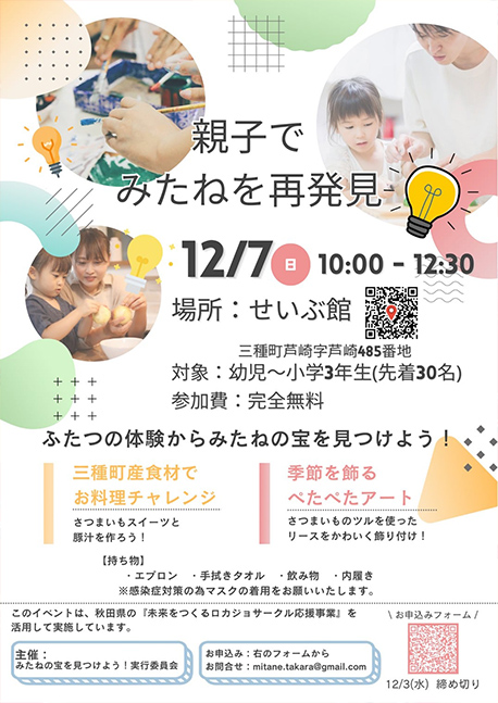 「親子に三種町の魅力を再発見してほしい」という思いから、三種町産食材で作るお料理、季節を飾るペタペタアートの2つのテーマのワークショップを令和7年12月7日(日)に実施しました。